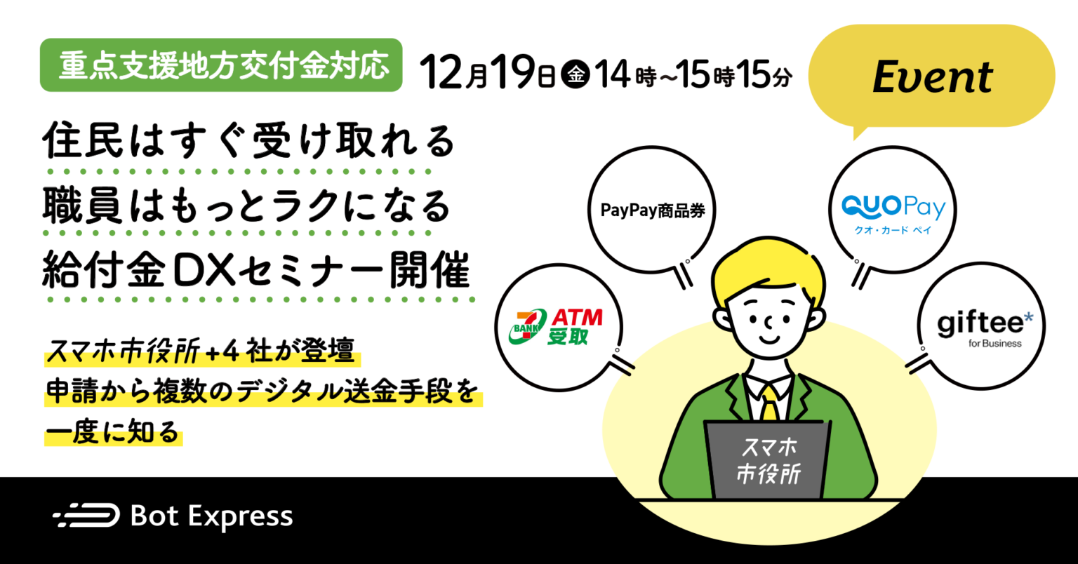 セミナーでは、LINEを活用した行政手続きサービス「スマホ市役所(GovTech Express)」を提供するBot Expressと、セブン・ペイメントサービス、クオカード、PayPay、ギフティの4社が登壇します。対象者データベースと連携した自動審査、公的個人認証による本人確認、LINE経由の交付決定通知や不備連絡、ATM受取やデジタル商品券など複数のデジタル送金手段を組み合わせた運用を解説します。明石市や湯沢市などで、LINE申請率95%や最短1〜4日給付を実現した事例も紹介されます。