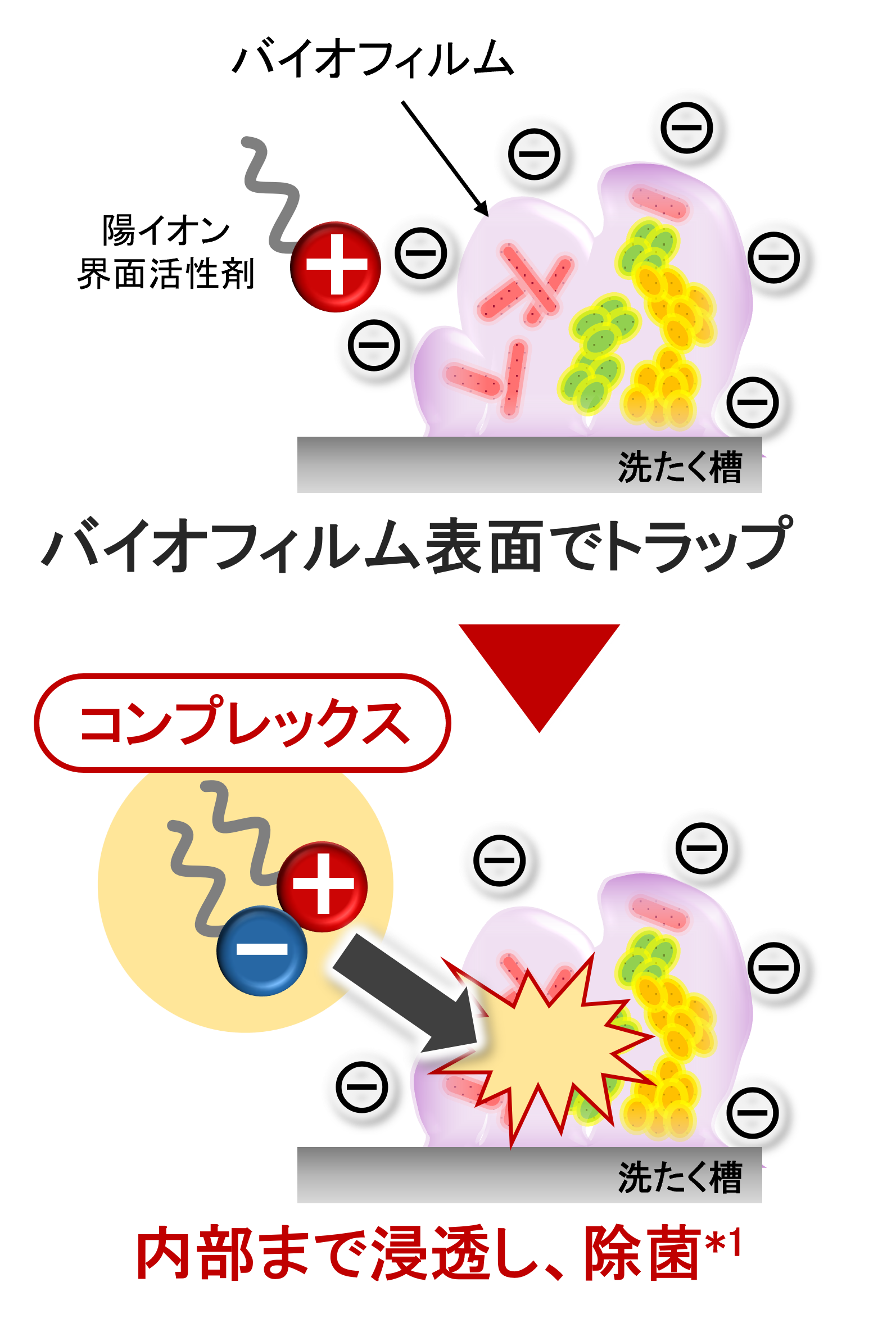 新技術は、陽イオン界面活性剤と、花王が開発した陰イオン界面活性剤「バイオIOS」を組み合わせ、最適なコンプレックス(複合体)状態を形成させる点が特徴です。等温滴定熱測定分析で界面活性剤同士の相互作用を解析し、除菌効果が消失するメカニズムを探索したうえで、除菌効果を維持したままバイオフィルム内部へ到達しやすい組み合わせを見いだしたと説明しています。