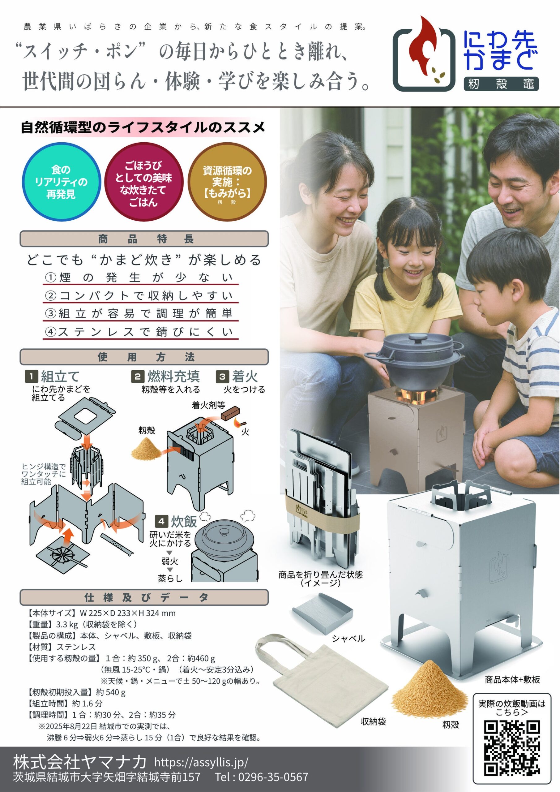 茨城県結城市の株式会社ヤマナカが展開するライフスタイルブランド「Assyllis(アッシーリス)」の折りたたみ式もみ殻燃料かまど「にわ先かまど」が、2026年3月10日、 「いばらきデザインセレクション2025」の選定と「第38回優秀板金製品技能フェア」の技能奨励賞をダブル受賞した。
