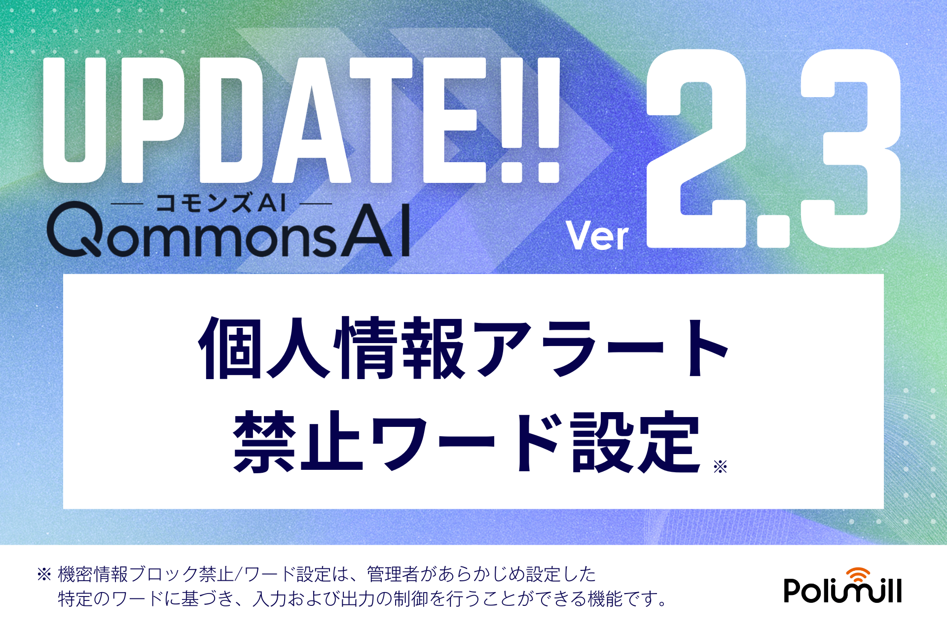 Polimill(東京都港区)は2026年4月1日、行政向け生成AI「QommonsAI(コモンズAI)」に、機密情報の意図せぬ入力を多層的に防ぐ「個人情報自動検知」「禁止ワードブロック」「検知・ブロックログ」の3機能を標準搭載する予定です。全国の利用自治体数は2026年3月時点で700以上、利用者は約25万人です。