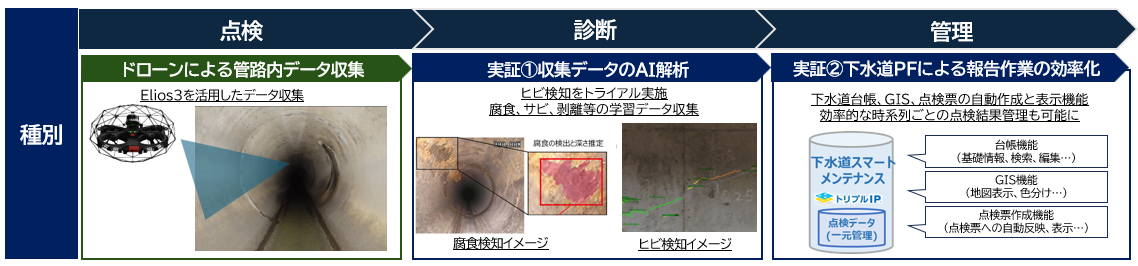 実証では、産業用ドローン「ELIOS 3」で管路内を撮影し、取得データを「eドローンAI」で解析してひび割れや腐食などを診断します。診断結果は「下水道スマートメンテナンスツール」によりGIS(地理情報システム)台帳と連携し、地図上で一元管理・可視化し、点検票の自動作成も行います。