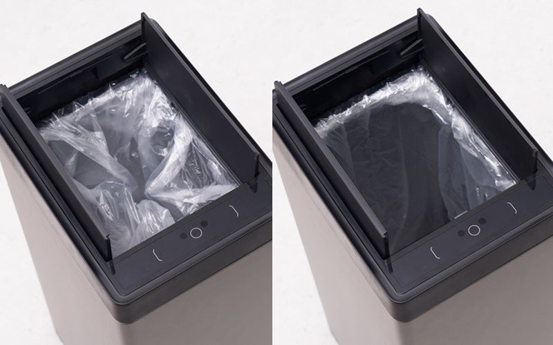 使い方は袋をセットしてボタンを押すだけで、静電気で貼り付きやすい袋でも空気が入り口を押し広げ、投入前の準備作業を減らします。ふたは非接触センサーで自動開閉し、手がふさがっている場面でも開閉操作を省けます。