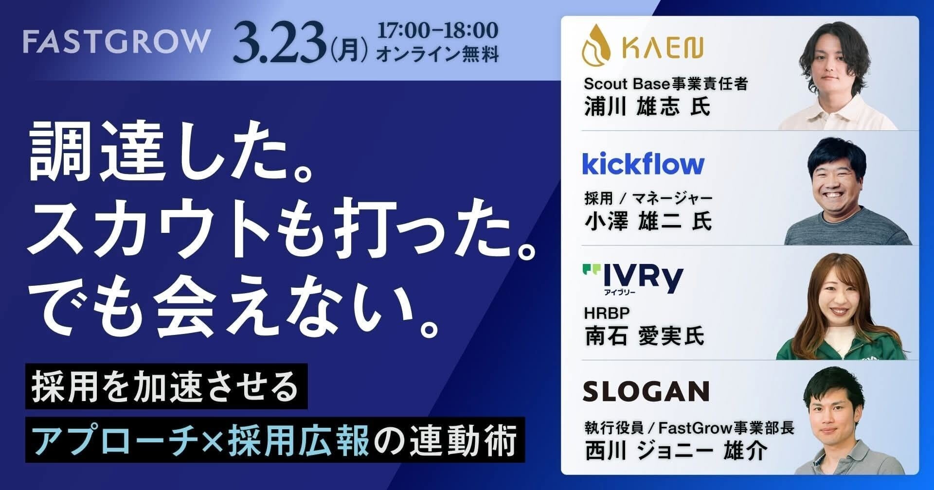 スカウト(候補者への直接アプローチ)と採用広報(認知・理解の獲得)を連動させ、知名度不足で優秀層に届きにくい課題や、スカウト文面が他社メッセージに埋もれる問題をどう超えるかが主題です。株式会社kickflow、株式会社IVRy、スローガン株式会社(FastGrow事業部)も実践ノウハウを共有します。