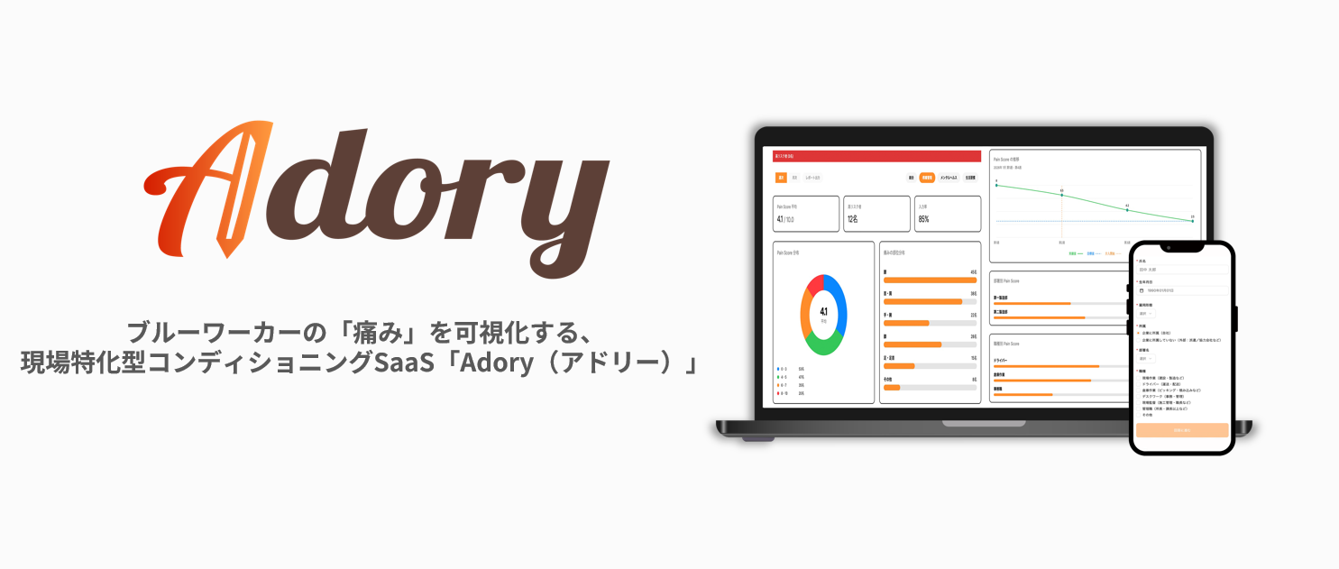 Adory(東京都品川区)は2026年3月16日、建設・運送・介護・警備・小売などの現場で働く従業員の「痛み・疲労・睡眠」などの身体状態を、週1回・約2分のLINE回答で可視化する現場特化型SaaS「Adory(アドリー)」の提供を始めました。部署別・職種別に集計したデータをダッシュボードで見られ、労災や離職の兆候把握を支援します。