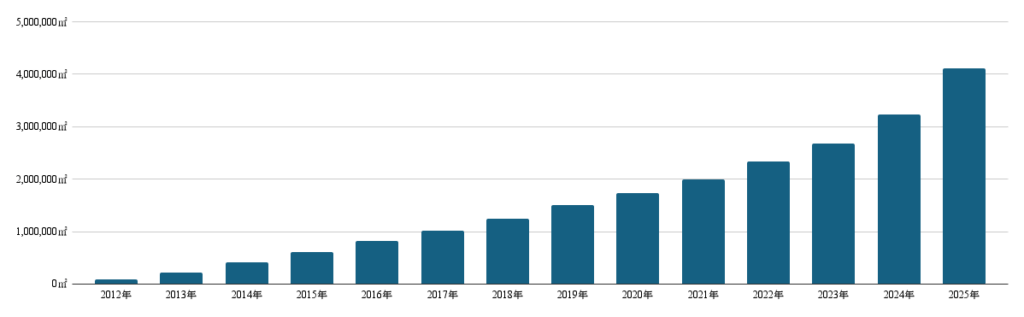 背景には、脱炭素経営やSDGsへの関心の高まりを受け、工場・倉庫などで暑さ対策と省エネを同時に狙う導入が増えていることがあります。販売は2008年の開始以降伸び、近年は年間100万㎡に届くペースだとしています。
