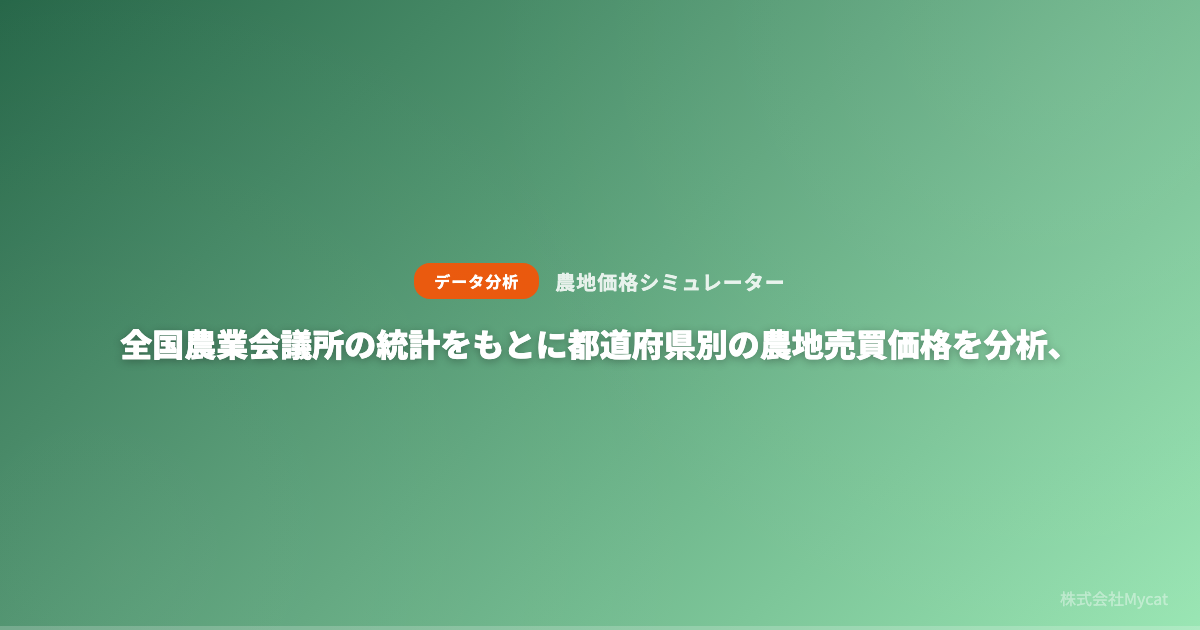 株式会社Mycat(東京都目黒区)は2026年3月21日、全国農業会議所の「田畑売買価格統計」を基に、都道府県別の農地売買価格を分析したレポートを公開しました。中田(標準的な田)の10aあたり売買価格は、都道府県間で最大約7倍の地域差があると示しました。