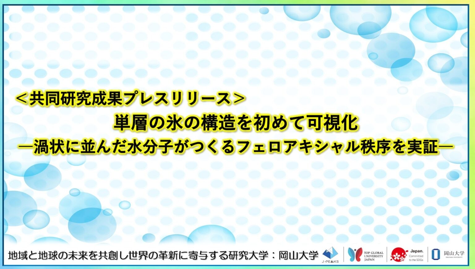 静岡大学や東京大学、岡山大学などの共同研究グループは、鉱物に閉じ込められた単層の水分子(単層氷)を調べ、低温で水分子が渦状に並ぶ「フェロアキシャル秩序」を示すことを明らかにしました。成果は米化学会誌に2026年2月13日付で掲載され、DOIは10.1021/jacs.5c19407です。