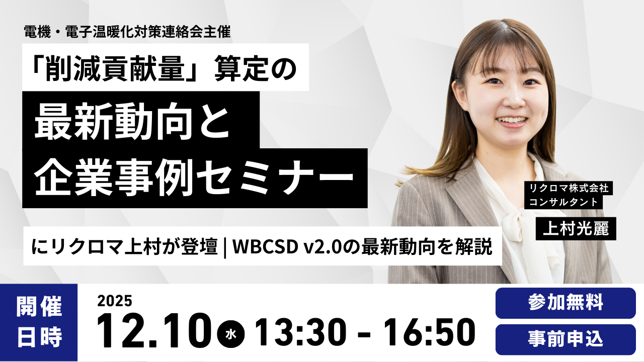 電機・電子温暖化対策連絡会は12月10日(水)13:30〜16:50、オンラインで「削減貢献量(Avoided emissions)」をテーマにした無料セミナーを開きます。定員は500人(事前登録制)。プログラムでは、リクロマの上村光麗氏がWBCSDガイダンスv2.0(2025年7月公表)の要点を解説し、企業の算定・開示実務への影響を示します。