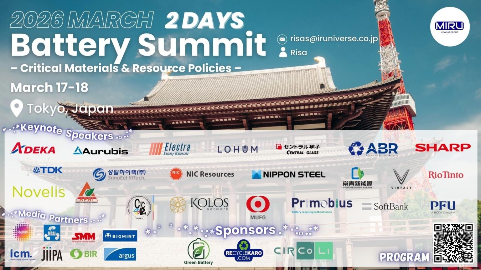 IRuniverse株式会社は、電池とクリティカルマテリアル(重要鉱物)産業を対象にしたセミナー「第13回 Battery Summit in TOKYO(Tokyo Battery Summit)」を2026年3月17~18日にベルサール御成門タワー(東京都港区)で開く。約25講演を予定し、参加者は約200~250名を見込む。申込は先着順で受け付けている。