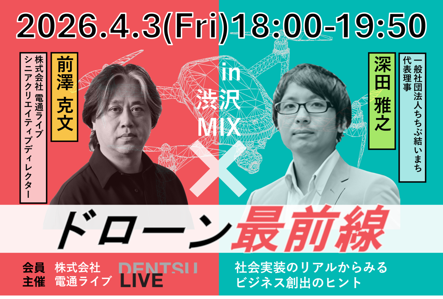 電通ライブは2026年4月3日18時から、埼玉県さいたま市のイノベーション創出拠点「渋沢MIX」で、セミナー・交流会「ドローン最前線 -社会実装からみる、ビジネス創出のヒント-」を開きます。参加費は無料で、定員は100人です。