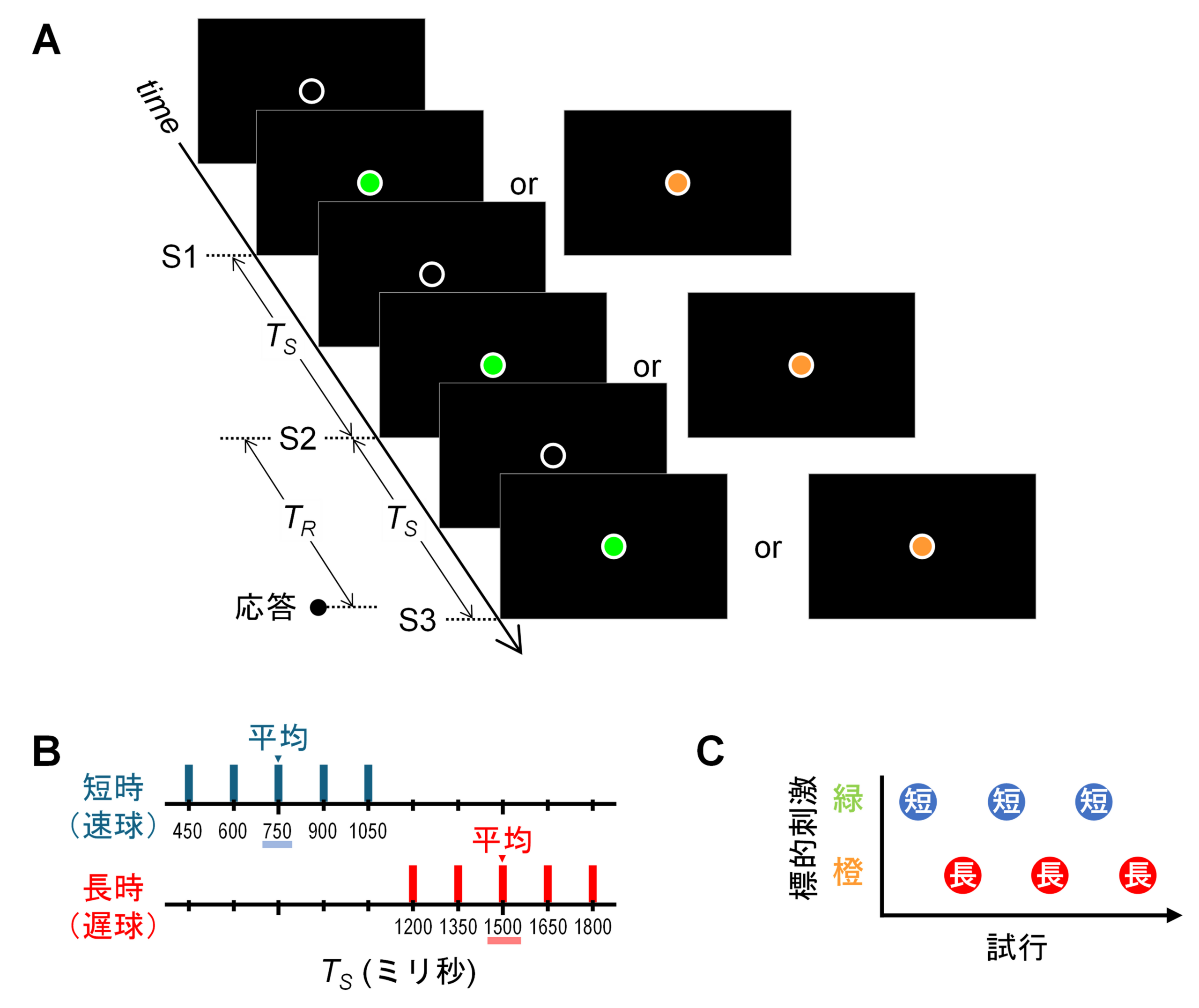 実験では、緑・橙の色で区別された短時分布(平均0.75秒、範囲0.45~1.05秒)と長時分布(平均1.5秒、範囲1.2~1.8秒)から選ばれる刺激時間間隔TSに基づき、被験者がS3出現と同時になるよう利き手人差し指でボタンを押しました。総試行数は640試行(40試行×16セッション)で、補足運動なし、非利き手での補足、足での補足の3条件を比較しました。
