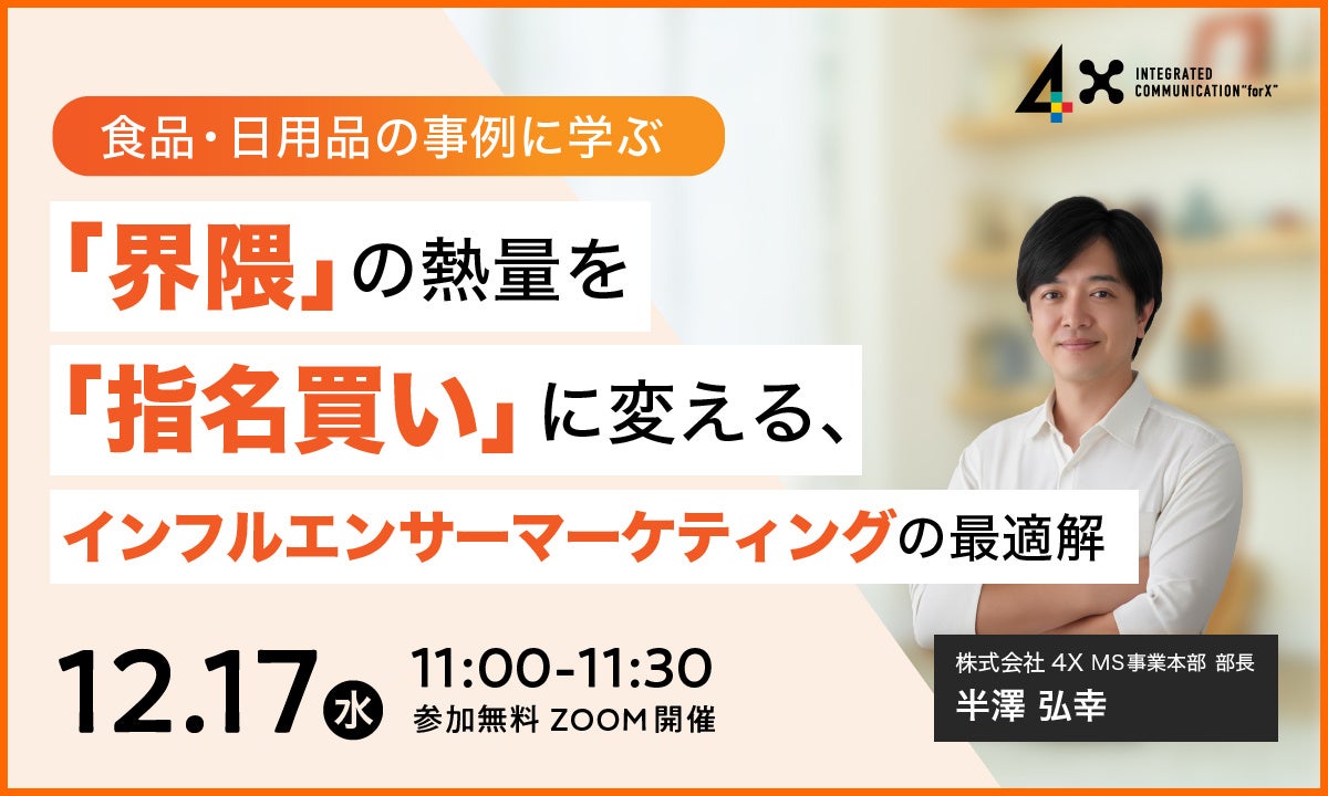 マーケティング支援を行う株式会社4X(東京・中央区)は、2025年12月17日(水)11時~11時30分に、無料のライブ配信ウェビナー「【食品・日用品の事例に学ぶ】『界隈』の熱量を『指名買い』に変える、インフルエンサーマーケティングの最適解」を開催します。SNSの普及で個人の発信力が高まるなか、同社は800社超の支援実績をもとに、フォロワー数よりもコミュニティの熱量を重視した手法を紹介します。
