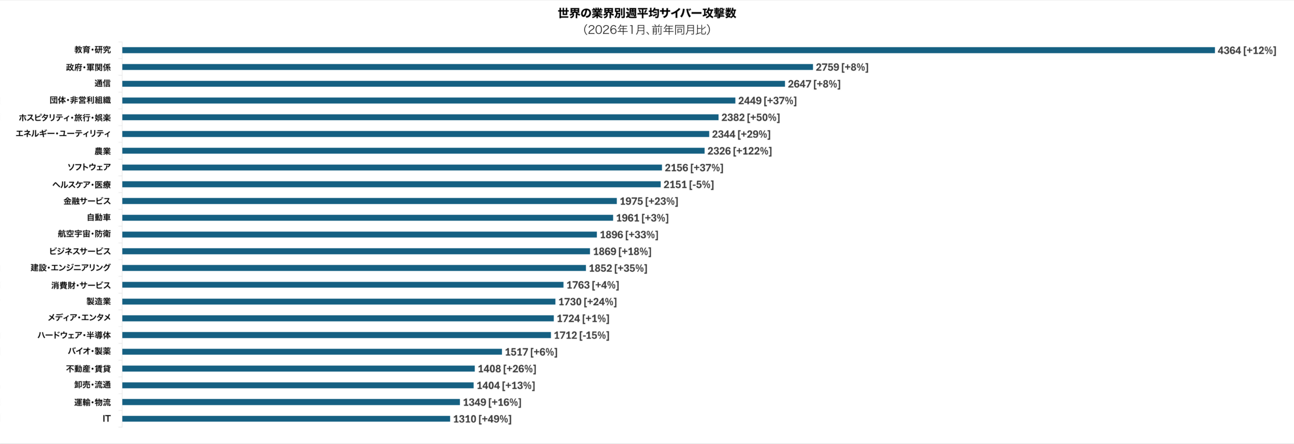 チェック・ポイント・リサーチ(CPR)は2026年2月17日、2026年1月の世界の週平均サイバー攻撃件数が1組織あたり2,090件となり、2025年12月比3%増、前年同月比17%増だったと明らかにしました。日本は同1,214件で前年同月比11%減でした。