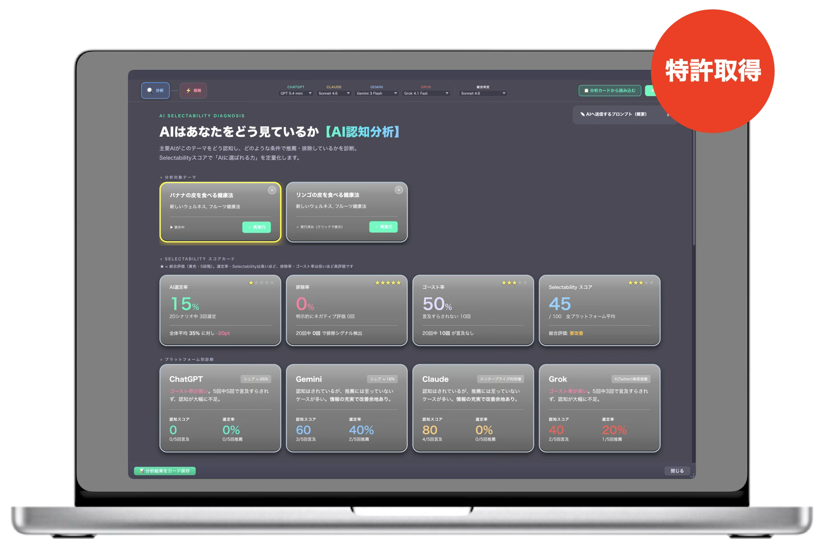 新機能は、分析対象の情報を入力すると4大AIへ診断用プロンプトを一斉送信し、結果をクロス解析してスコア化します。算出する指標は選定率・排除率・ゴースト率・Selectabilityスコアの4つで、ブランドがAI回答の候補に挙がりやすいかを数値で示します。