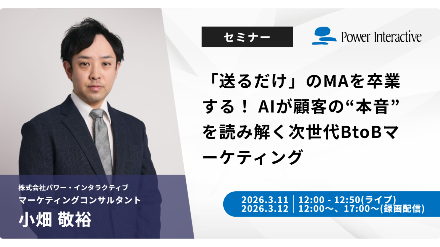 パワー・インタラクティブ(大阪市中央区)は、無料ウェビナー「『送るだけ』のMAを卒業する! AIが顧客の“本音”を読み解く次世代BtoBマーケティング」を2026年3月11日12:00〜12:50にライブ配信し、3月12日には12:00~12:50と17:00~17:50に録画配信します。講師はマーケティングコンサルタントの小畑敬裕氏です。