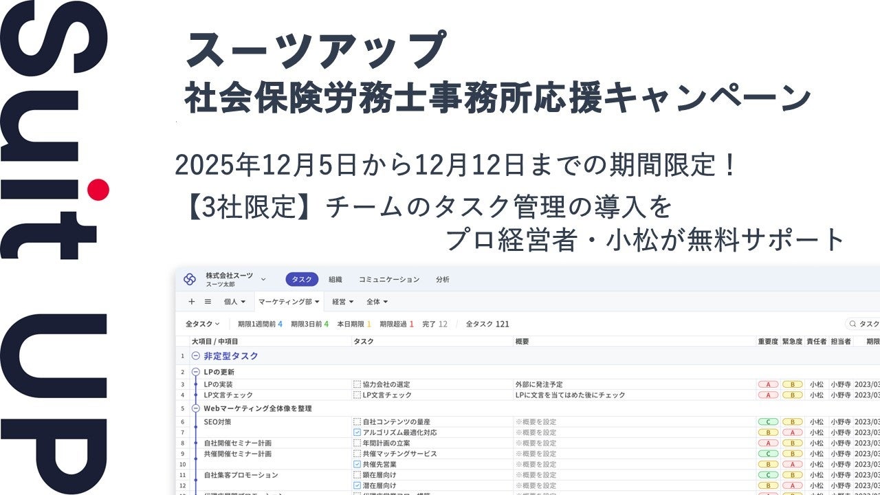 経営支援クラウド「スーツアップ」が、社会保険労務士事務所を対象に月額利用料を3カ月無料とするキャンペーンを始めます。期間は2025年12月5日から12日までで、応募フォーム経由で申し込んだ事務所のうち3社が対象となります。通常料金は1人あたり月額1,080円(税別、10人以下のスタータープランは500円)で、当選すると人数分の利用料が無料になります。
