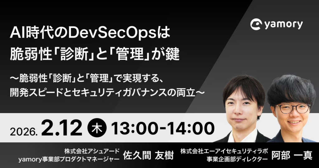 エーアイセキュリティラボとアシュアードの脆弱性管理クラウド「yamory」は、脆弱性対策をテーマにした共催ウェビナーを2026年2月12日13時から14時までZoomで開きます。参加費は無料で、開発高速化で増えるリスクに対し、脆弱性の「診断」と「管理」を開発プロセスへ組み込み、速度とガバナンスの両立を狙います。
