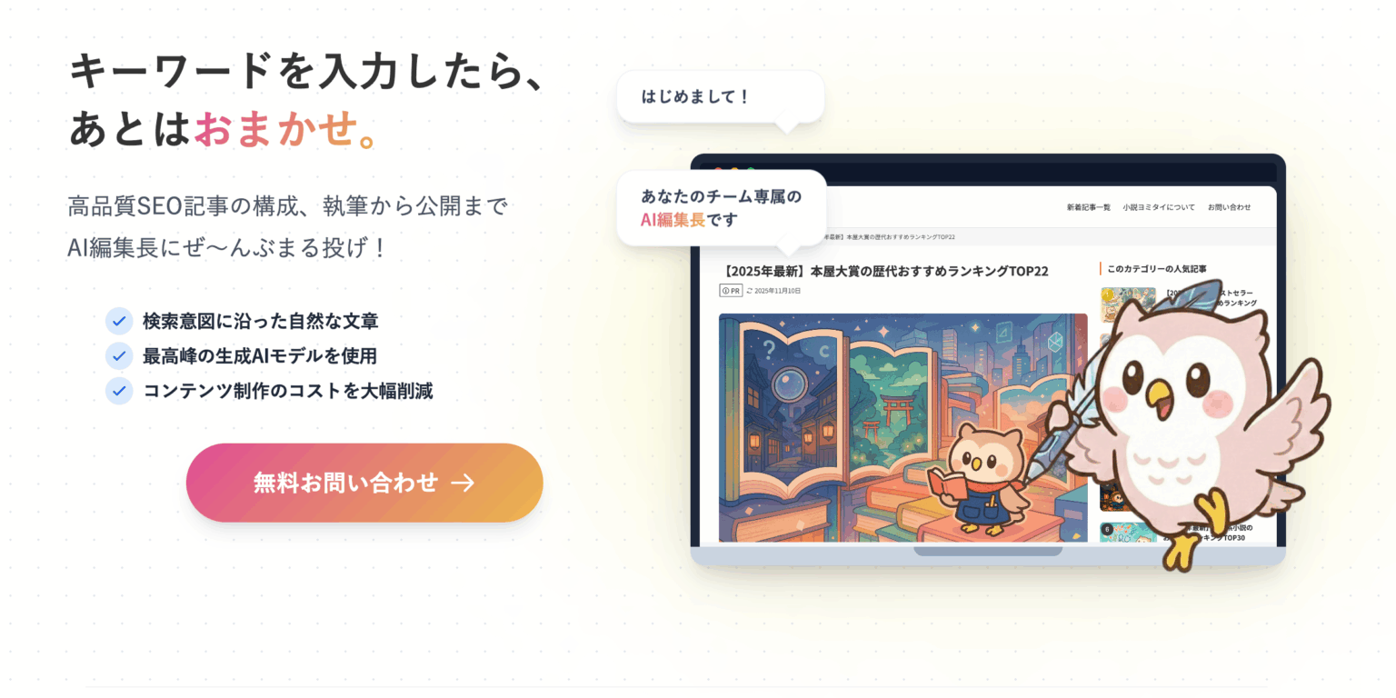AI記事制作エージェント「AI編集長」の公式サイトが公開されました。1記事あたり平均100回以上の大規模言語モデル(LLM)処理を重ね、構成作成から執筆、装飾、画像生成、リンク挿入、CMSへの投稿までを最短約20分で自動化します。SEOに最適化した高品質記事の量産を狙い、導入費用は業界最安級の水準としています。