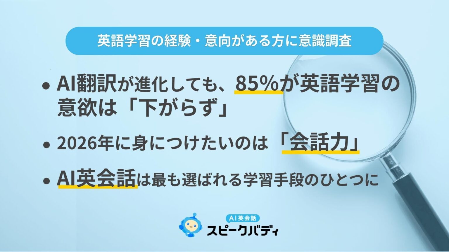 スピークバディが国内の20〜59歳439人を調べたところ、AI翻訳の進化後も英語学習意欲が「下がらない」と答えた人は85.4%で、うち54.0%は「むしろ高まった」とした。意欲が下がらない理由は「自分で話せる達成感」(33.6%)や「直接話す方が親密になれる」(32.3%)が上位だった。2026年に英語学習へ「取り組む予定がある」は70.2%。目的は「仕事で海外の人と交流が必要」(28.9%)、「キャリアアップ・転職」(28.2%)、「海外旅行」(26.9%)が中心となった。身につけたい技能は「スピーキング力」(58.8%)が最多で、「リスニング力」(51.6%)が続く。学習手段は「AI英会話アプリ」が44.8%で最も多く、話す練習の効率化が追い風となっている。今後も翻訳支援が広がる一方、対話の場面で自分の言葉で伝える需要が学習を下支えするとみられる。