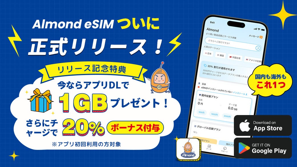 ビッグコネクト(東京都新宿区)は2026年3月3日、海外eSIM通信ブランド「AlmondSIM」で、世界200カ国以上の回線をスマートフォンで購入・管理できる「Almond eSIM 公式アプリ」(iOS/Android、無料・アプリ内課金あり)の提供を始めました。新規登録者には国内1GB無料(200円分残高)と、海外eSIM全品20%OFFクーポンを付与します。