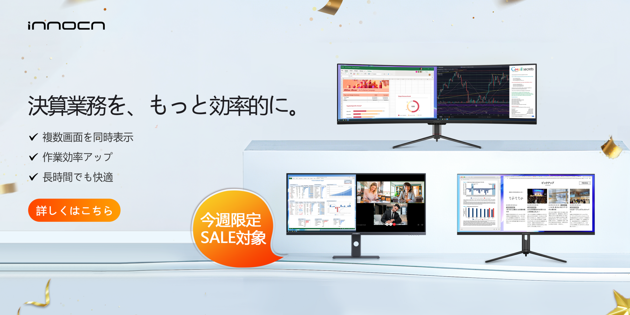 Amazonの「新生活応援セール」で、INNOCNのビジネス向けモニター各種が2026年3月3日0時から3月9日23時59分(GMT+9)まで最大30%OFFで販売されます。対象は在庫がなくなり次第終了で、製品により期間が異なる場合があります。