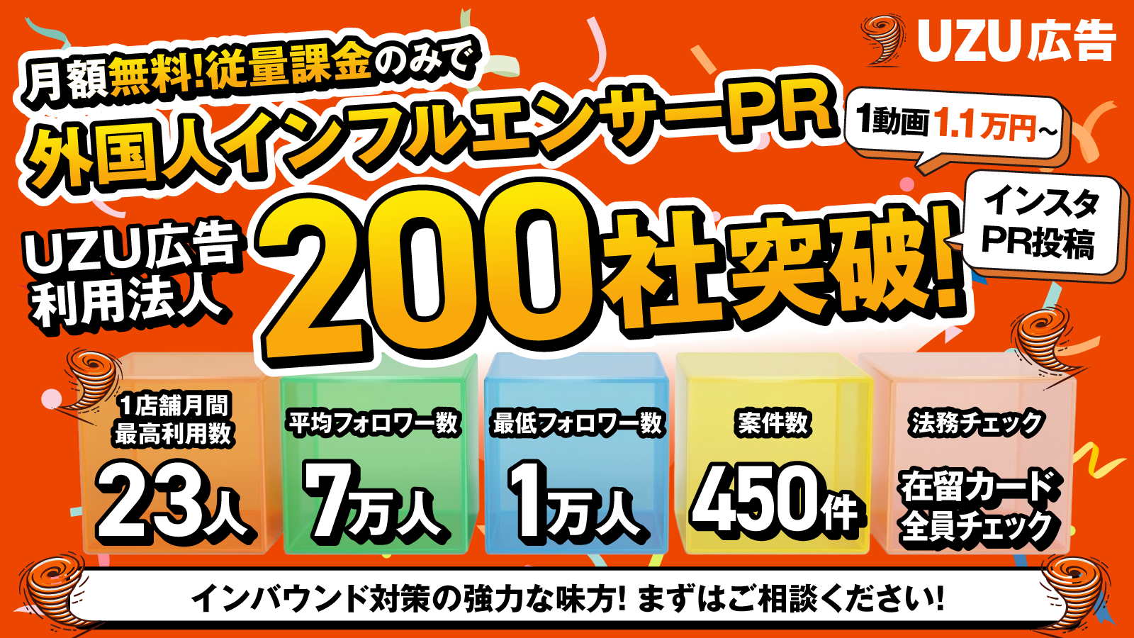APOC(東京都)は3月25日、外国人インフルエンサー広告プラットフォーム「UZU広告」の導入企業数が2026年3月時点で200社を突破したと明らかにしました。再生数とCPV(1再生あたりの広告単価)で投稿ごとの効果を数値化し、広告として運用できる点を特徴とします。