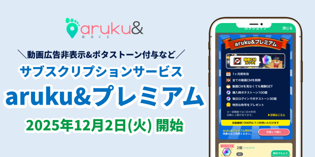 歩数連動のウォーキングアプリ「aruku&」が2025年12月2日、月額制の新機能「aruku&プレミアム」(月1,380円)と称号機能を導入しました。累計ダウンロードは270万。プレミアムは動画広告を非表示にし、初回100個・毎日30個の「ポタストーン」を付与、1000歩ミッションの獲得上限を5回増やして最大300ポイントまで拡張します。運営は東京都港区のONE COMPATHです。