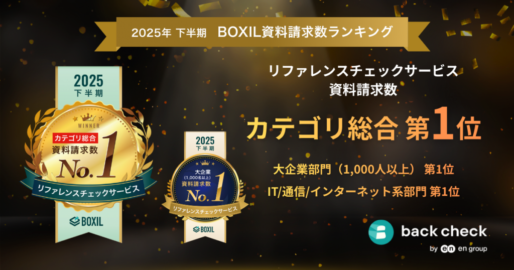 エン株式会社(東京都新宿区)グループのオンライン完結型サービス「back check」が、SaaS比較サイト「BOXIL」の「2025年下半期 BOXIL資料請求数ランキング」で、リファレンスチェックサービスカテゴリ総合1位となりました。集計期間は2025年7月1日〜12月31日です。