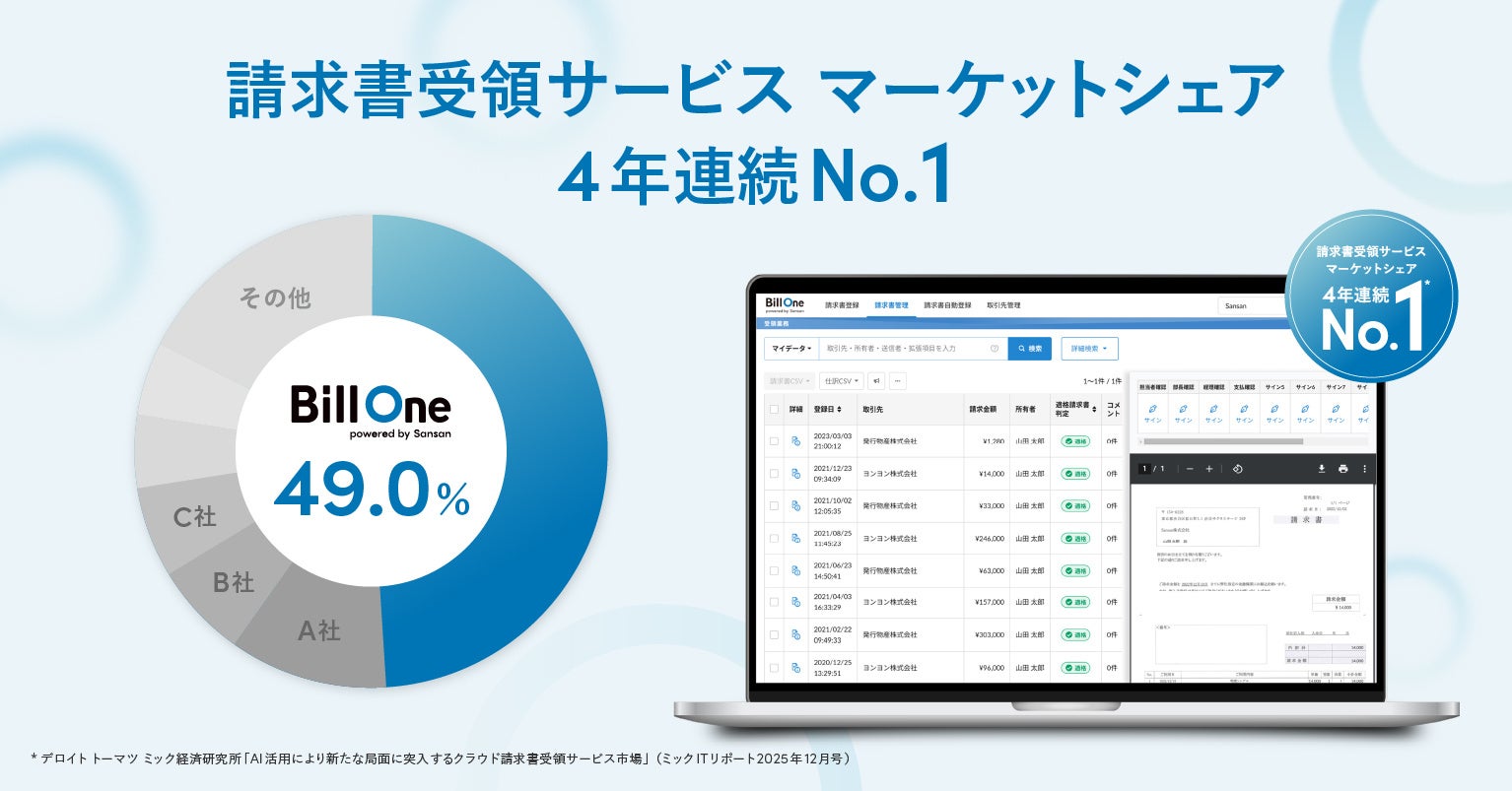 Sansanの経理DXサービス「Bill One」が、デロイト トーマツ ミック経済研究所の請求書受領サービス市場調査で4年連続マーケットシェアNo.1となり、売上シェアは49.0%に拡大しました。同調査では市場が年率29.3%で成長し、2029年度に普及率47.1%、市場規模740億円に達すると予測しています。首位要因として、AI-OCRとオペレーターの二重チェックでデータ化精度99.9%をうたう運用体制や、自社設備のオペレーションセンターによるセキュリティ面の信頼性が挙げられました。さらに自然言語処理で表記ゆれを補正し、照合・起票などの自動化機能につなげる開発力も評価点です。Sansanは2025年8月末時点でBill OneのARRが118億円を超えたとしており、2026年度以降のAI機能普及と同一ベンダー製品の導入増を追い風に、対象業務領域の拡大を進める見通しです。