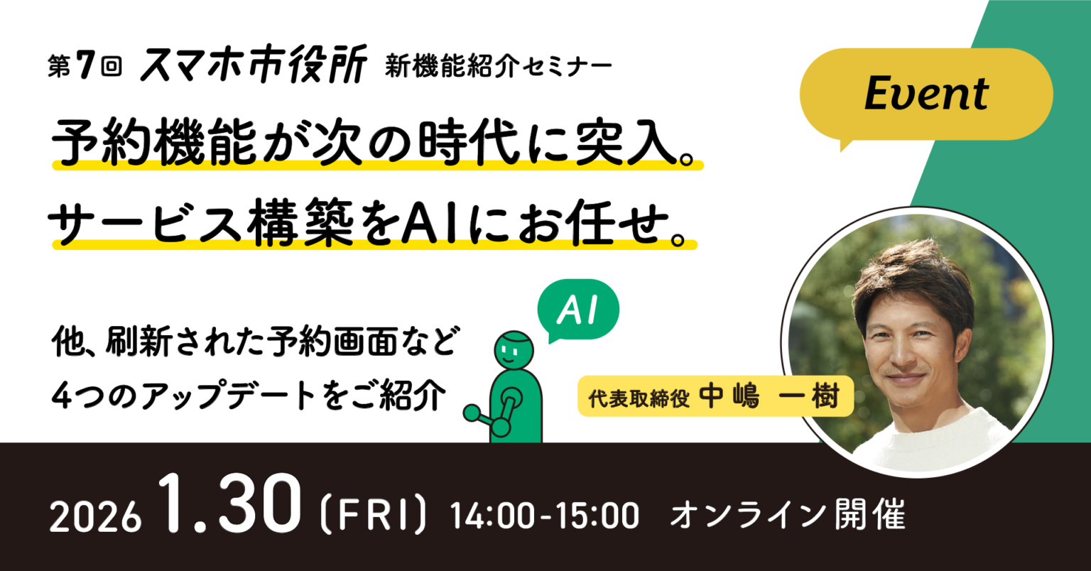 Bot Express(東京都港区)は2026年1月30日14時〜15時、官公庁向け対話型アプリ「GovTech Express(スマホ市役所)」の新機能を説明するオンラインセミナーを開きます。テーマは、公共施設予約の設定作業をAI(Copilot)が支援する機能などで、参加申込は開始直前まで受け付けます。