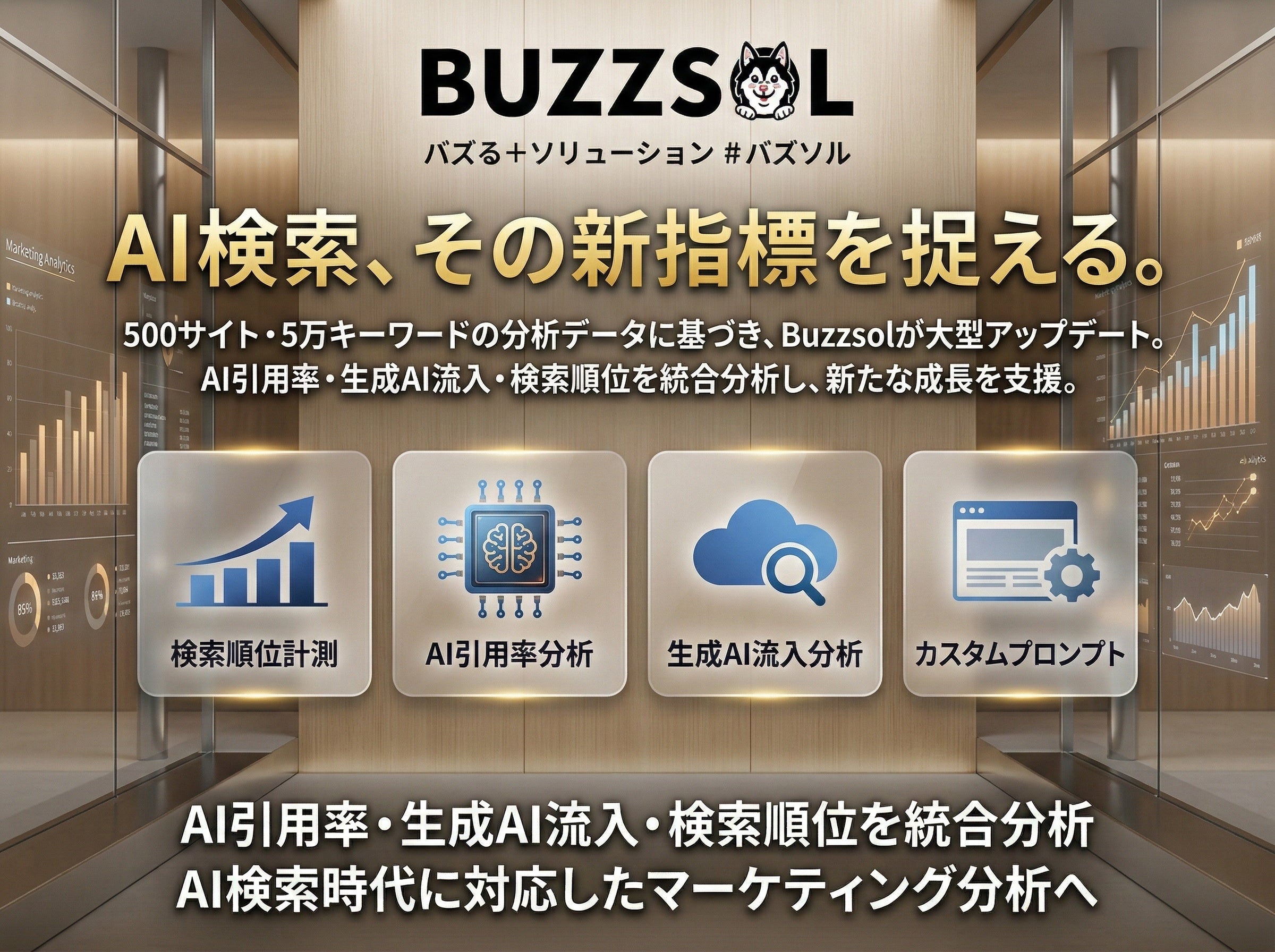 株式会社バックステージ(東京都千代田区)が運営するBuzzsolは2026年3月5日、Google検索順位計測に加え、AI Overviewsの引用率分析や生成AI経由のWebサイト流入分析など、AI検索指標の可視化機能を強化し、AI最適化の実装支援の提供を始めました。横断分析では、生成AI経由の流入割合が62%(500サイト超)だったとしています。