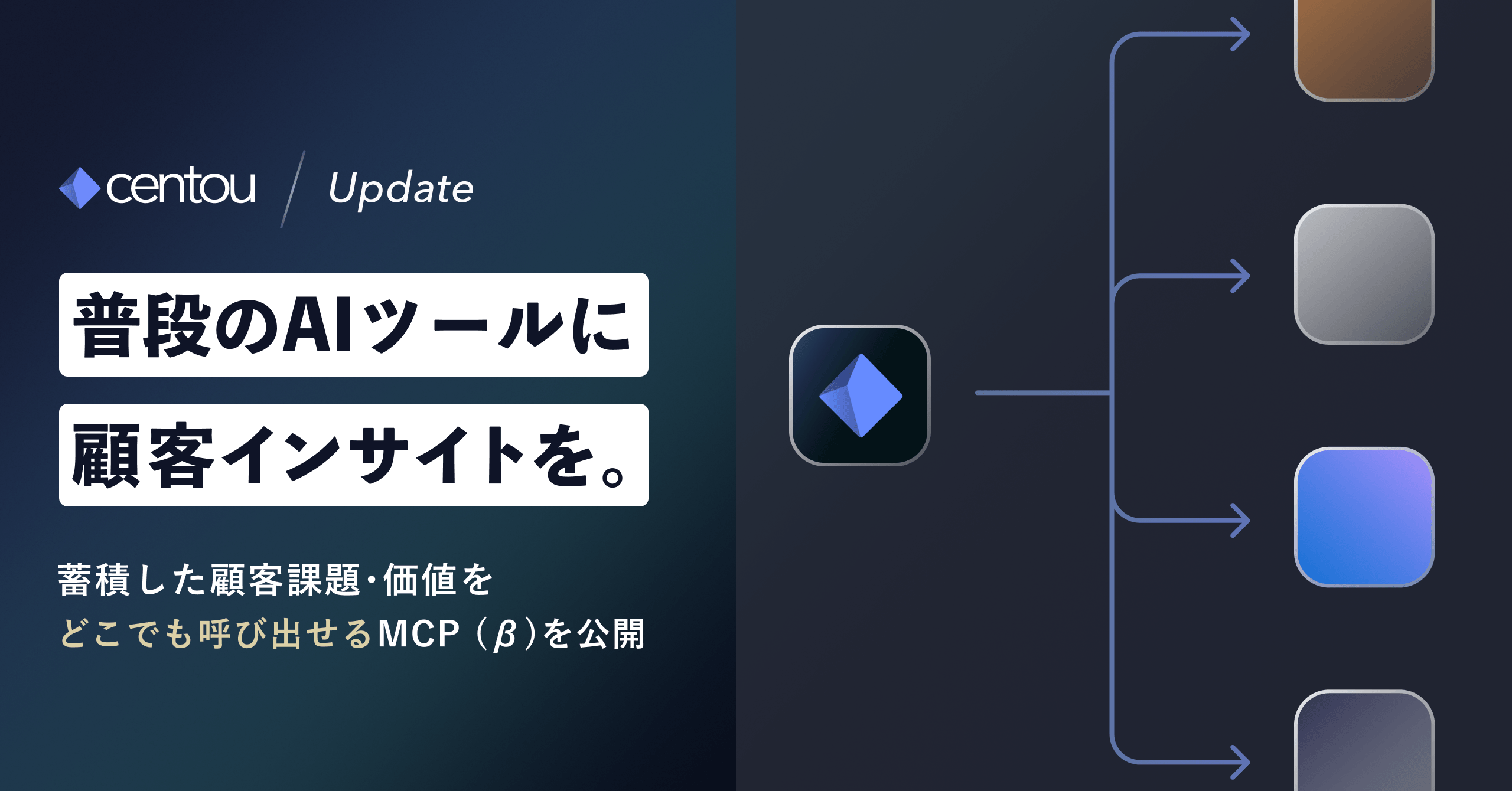 生成AIの業務利用が広がる一方、出力の妥当性やニーズの有無を「顧客インサイト(顧客理解にもとづく示唆)」で裏取りしづらいことが課題でした。新機能は、普段使うAIツール側からCentouの蓄積データへアクセスし、インサイト視点で生成物を補強する狙いです。