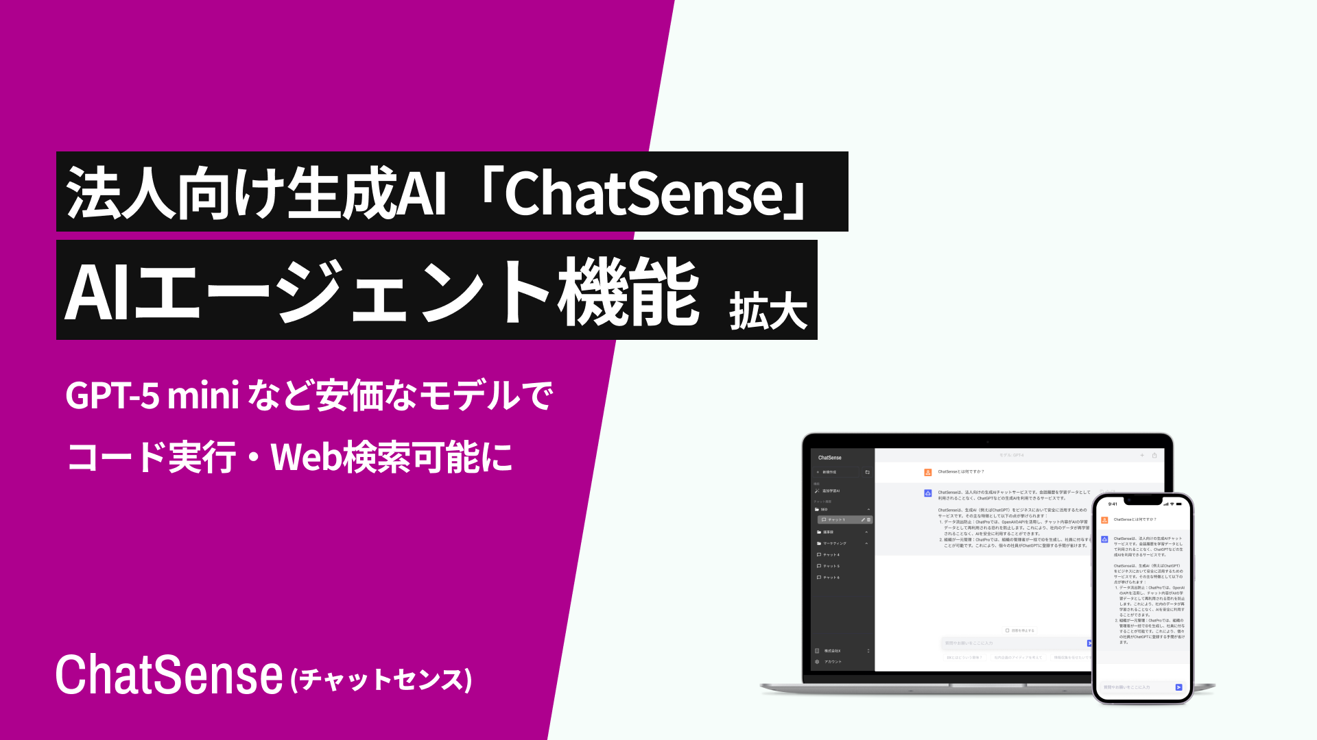 株式会社ナレッジセンス(東京都港区)は法人向け生成AIエージェント「ChatSense」で、GPT-5 miniとGPT-5 ThinkingにWeb検索とファイル分析(コードインタープリター)を標準搭載します。開始は2026年2月1日で、同日からコードインタープリターのセッション料金も無料化します。導入社数は500社以上です。