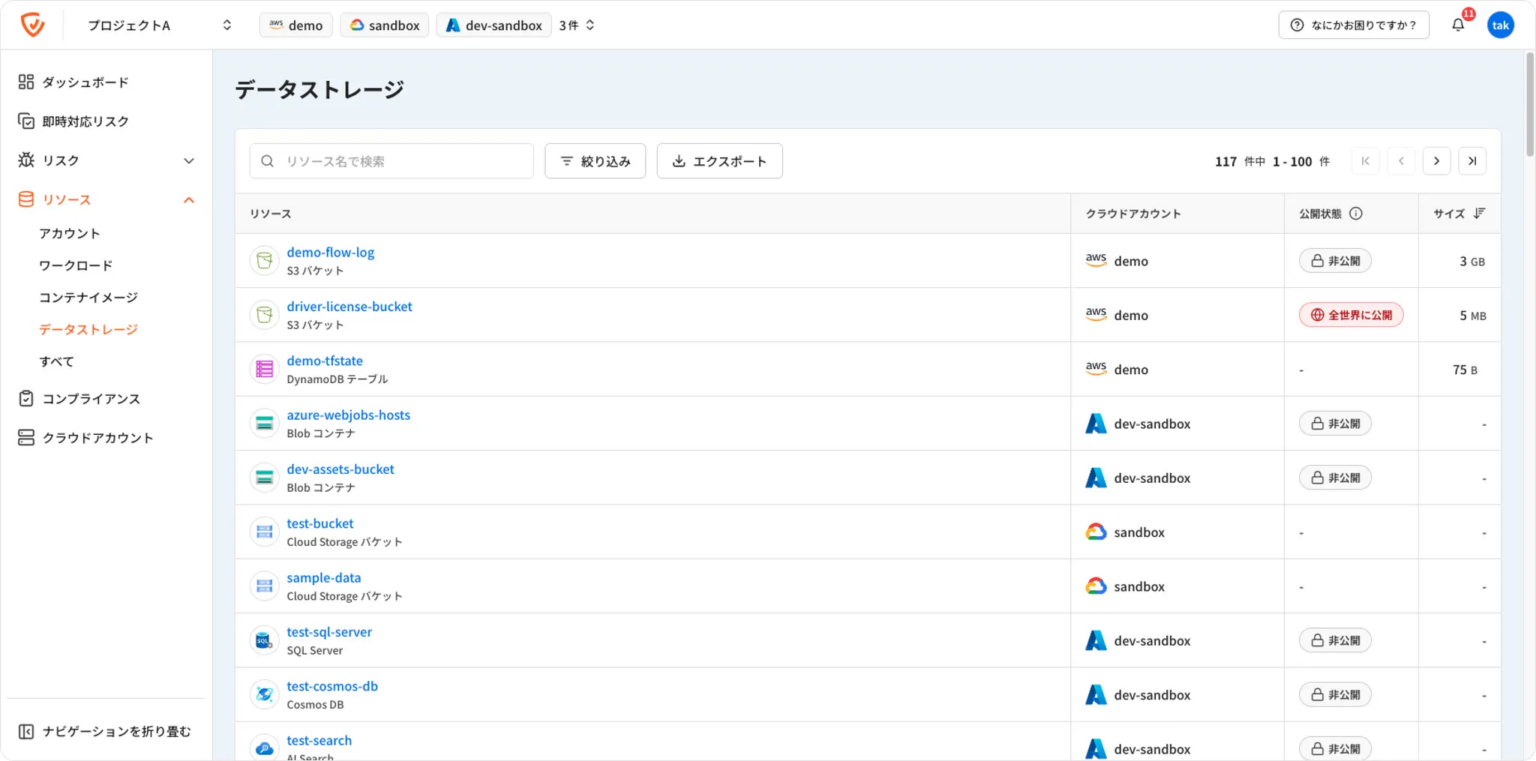 新画面はプロジェクトページ配下のサイドバー「リソース>データストレージ」から利用でき、AWS/Azure/Google Cloudのデータストレージを横断して表示します。リソース名・種別・クラウドサービスに加え、検出クラウドアカウント、インターネット公開状態、データ量(サイズ)などを可視化します。