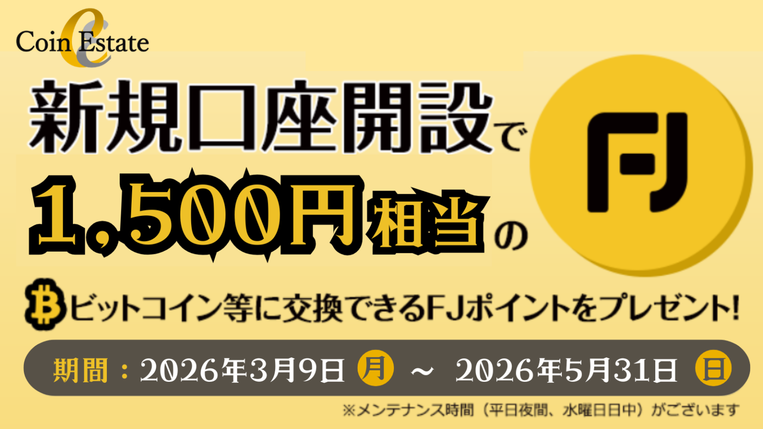 暗号資産販売所「Coin Estate」、新規口座開設で1,500円相当のFJポイントをプレゼント!日本円入金で最大6,500円相当!