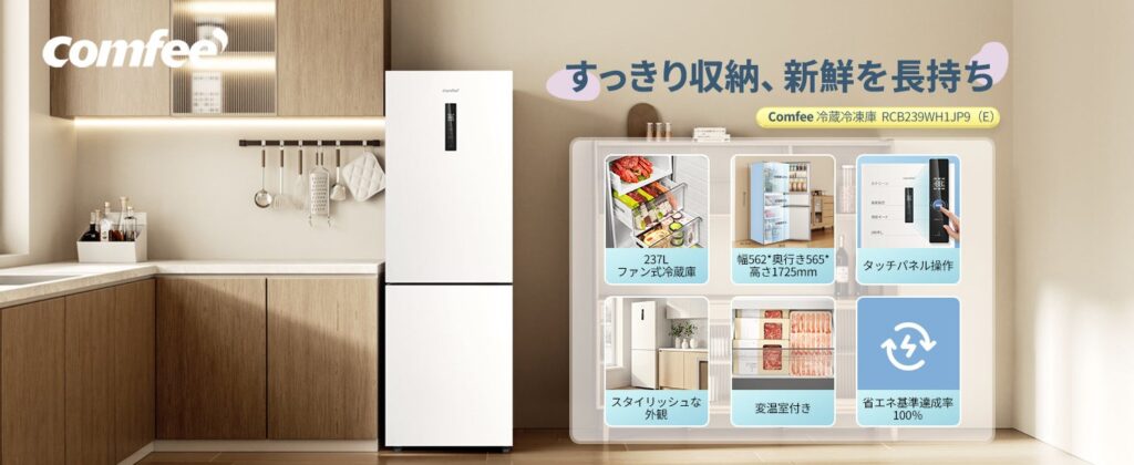 日本美的は2026年新モデルの237Lファン式冷蔵庫を発売し、3月9日20時からComfee公式Amazonストアで販売を始めました。総容量は237L(冷蔵114L・変温33L・冷凍90L)で、セール売価は4万2980円(14%OFF、3月16日まで)としています。
