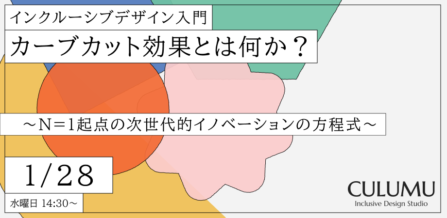 インクルーシブデザインスタジオ「CULUMU」は、無料オンラインセミナー「【インクルーシブデザイン入門】カーブカット効果とは何か?」を2026年1月28日14時30分からZoomで開きます。車椅子利用者の段差解消ニーズから広がった「カーブカット」を起点に、特定の当事者(N=1)の課題解決が社会全体の利便性へ波及する現象を解説します。