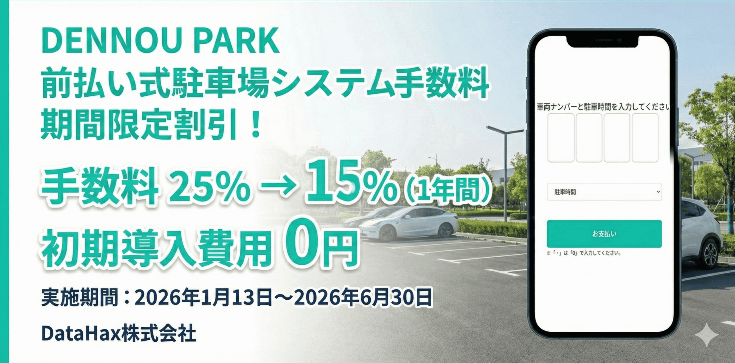 DataHax株式会社は、スマートAI駐車場サービス「DENNOU PARK」の前払い式駐車場向けに、駐車場売上に対するシステム手数料を通常25%から15%へ引き下げるキャンペーンを2026年1月13日~6月30日に実施します。割引は契約開始から1年間適用し、初期導入費用5万円も無料にします。適用条件は前払い式での契約と、契約後に半年以上の運営継続です。同社は、初期投資が難しい土地オーナーや短期運用を検討する利用者の参入障壁を下げる狙いだとしています。前払い式は、駐車後すぐ固定料金を支払う形式で、12時間・24時間など長い時間単位の料金設定が一般的です。分単位課金の時間貸しに比べ徴収方式の制約はある一方、看板設置のみでも開始でき、設備投資を抑えやすいといいます。「DENNOU PARK」はAIカメラとクラウドで車両を認識し、入出庫時間や料金管理を行う仕組みで、フラップ板やゲート、発券機、精算機などを不要とします。利用者はスマートフォンからクレジットカードやPayPayなどでキャッシュレス決済できるとしています。今後は、手数料・初期費用の負担軽減が導入検討層の意思決定をどこまで後押しし、前払い式の設置拡大につながるかが焦点になります。