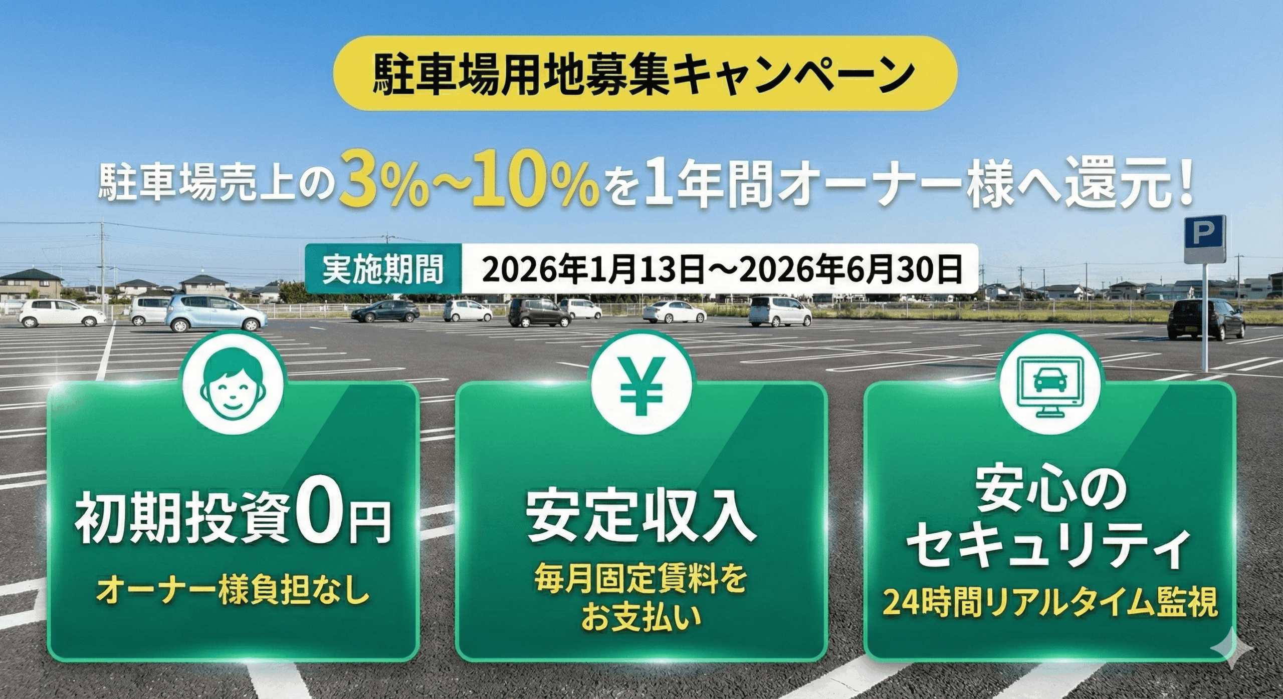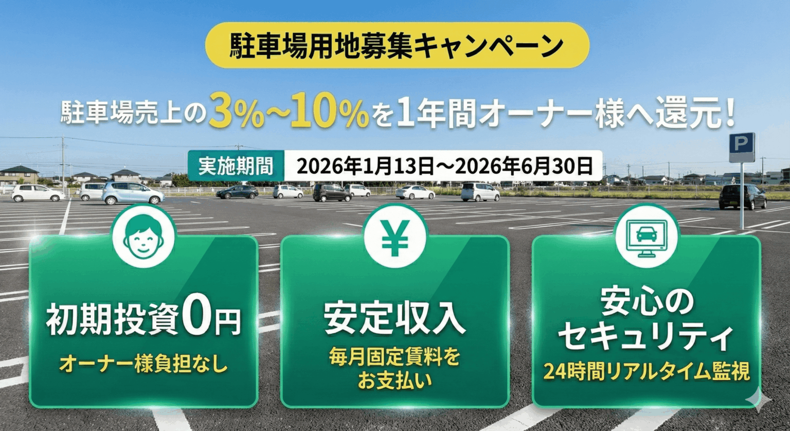 DataHaxはスマートAI駐車場「DENNOU PARK」で、土地オーナー向けの新規契約キャンペーンを2026年1月13日〜6月30日に実施します。期間内の新規契約を対象に、通常の毎月固定賃料に加え、契約開始から1年間は駐車場売上の3%〜10%を上乗せして支払います。