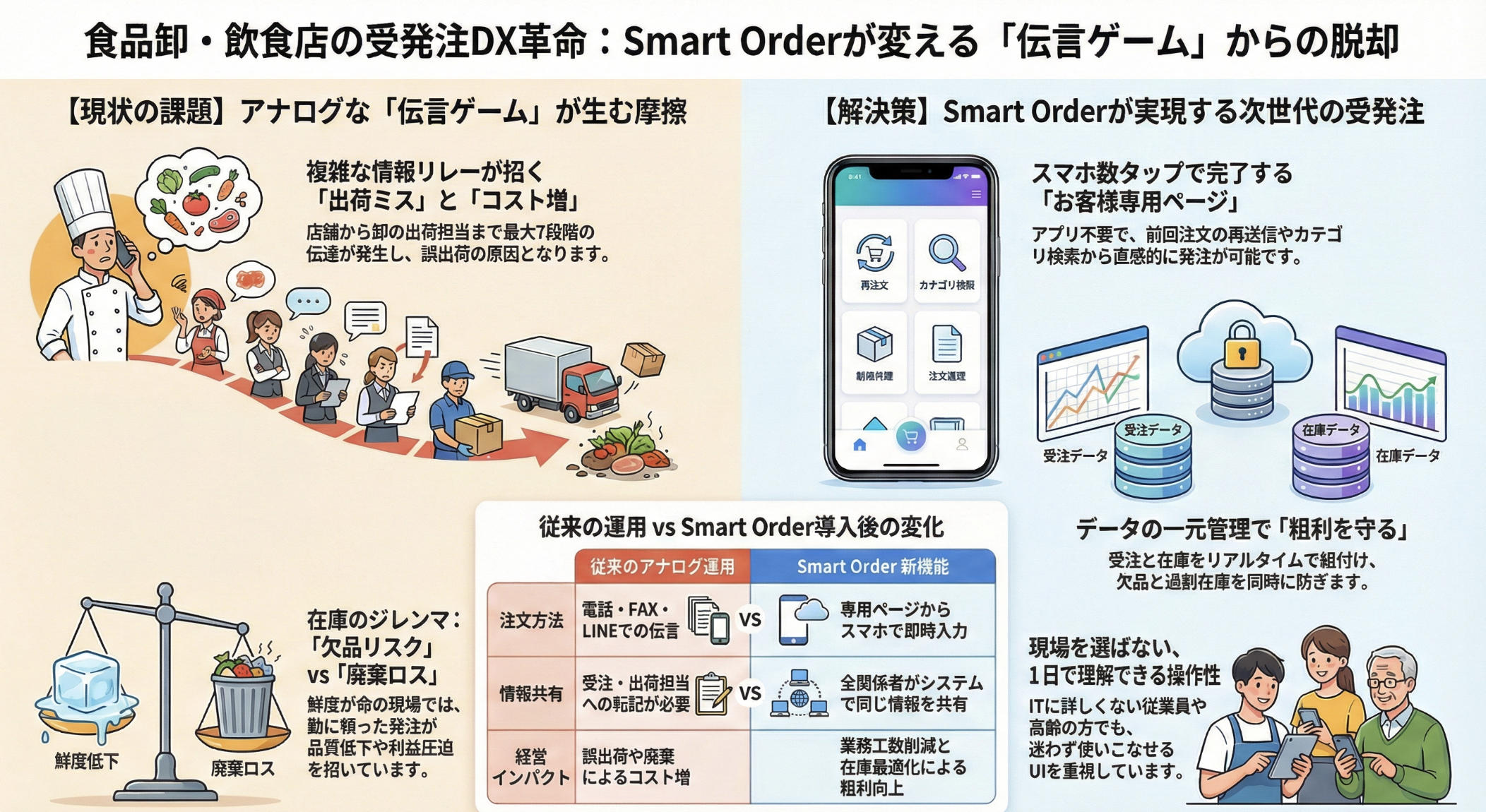 新機能は、卸側が取引先店舗ごとに専用ページを発行し、飲食店はアプリ不要で商品選択、数量入力、納品希望日を指定して送信します。卸側は受注・仕入・出荷の関係者が同一画面で内容を共有し、確認の重複や伝達ミスを減らします。さらに在庫管理機能「Smart Stock」と連携し、在庫を見える化して欠品や過剰の早期把握、滞留在庫の抑制、返品・廃棄の抑制につなげます。