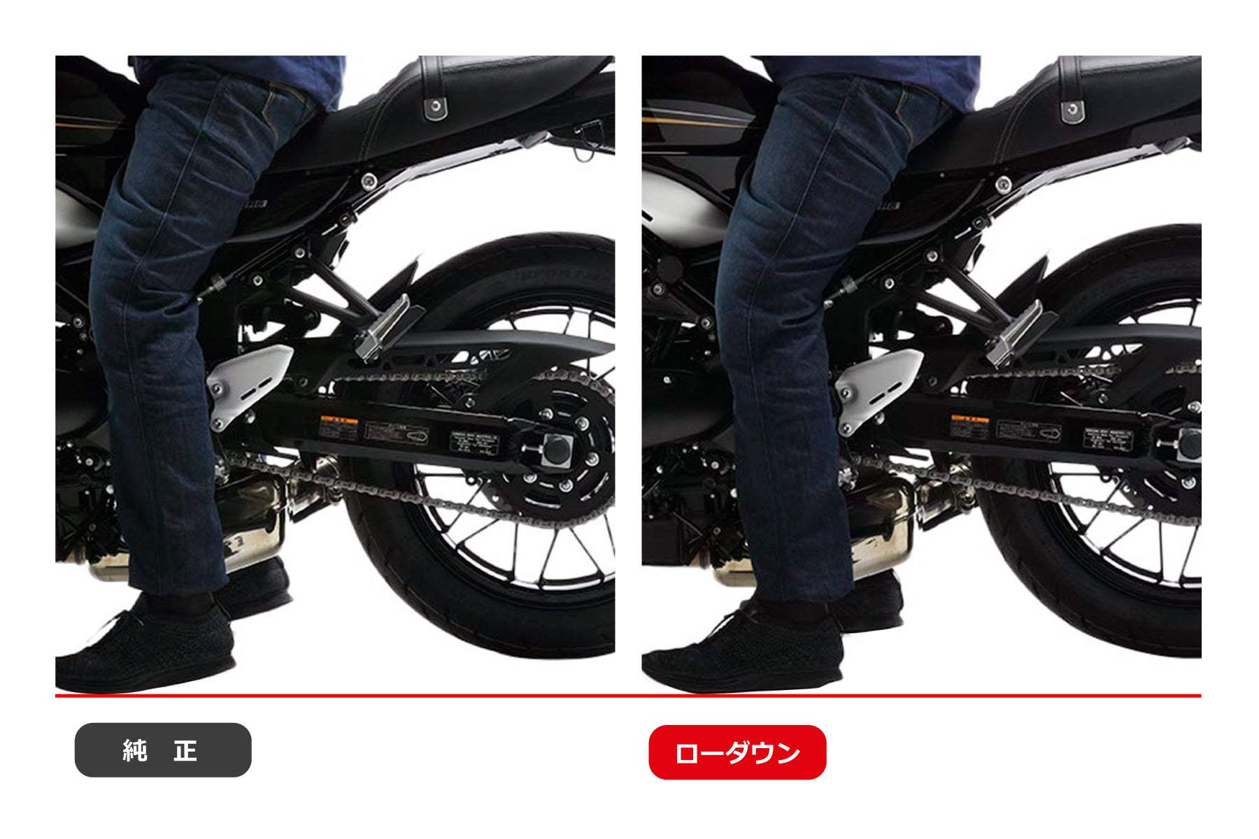 ローダウンは純正リアサスペンションのリンクプレート部を交換して車高を下げる方式で、停車時のふらつきなど不安を減らし足つき性の改善を狙います。ダウン量は車種ごとに設定し、純正の乗り味を悪化させない前提で開発したとしています。