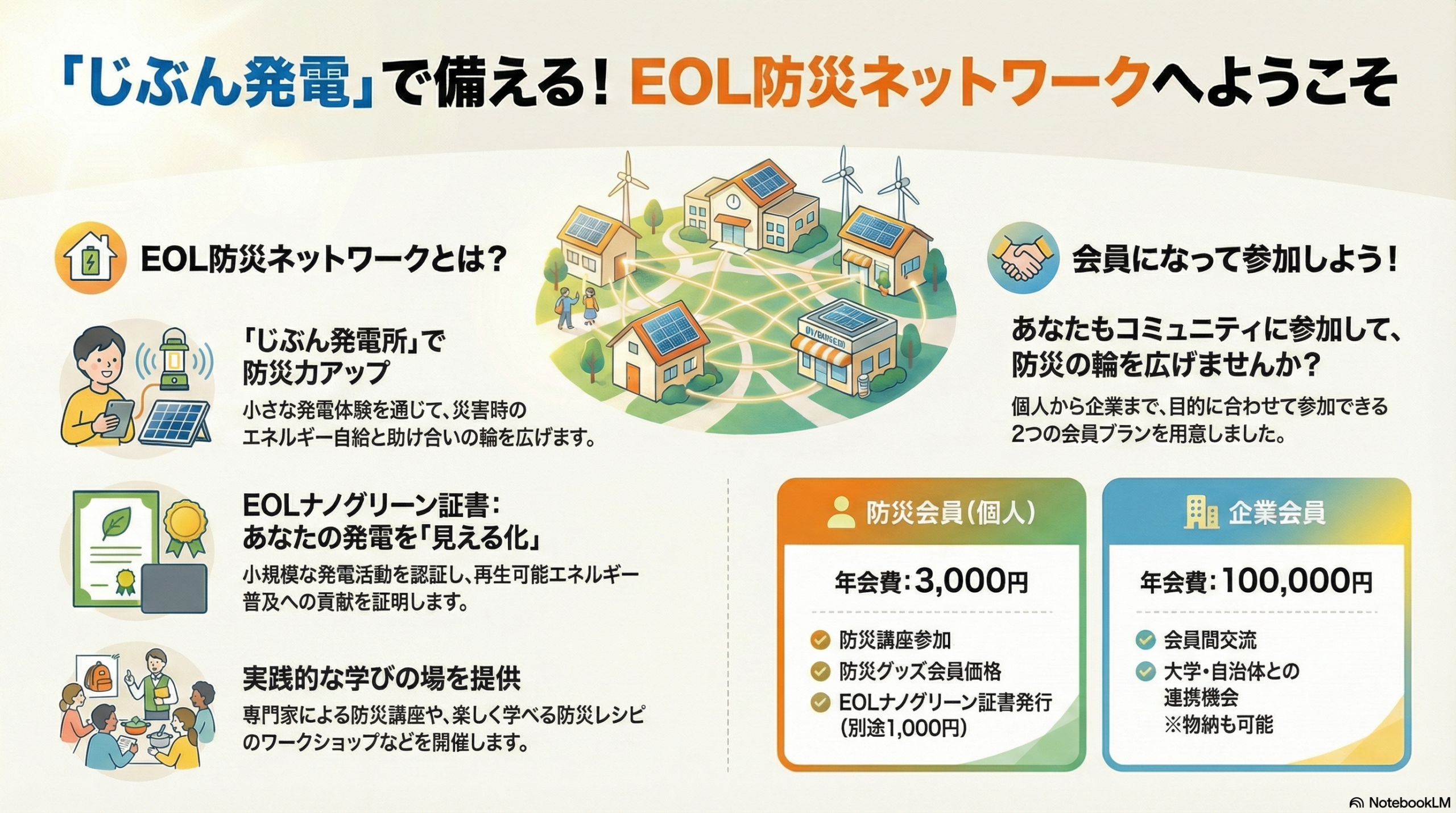 NPO法人エコロジーオンライン(EOL、栃木県佐野市)は2000年設立から26年目となる2026年に、再生可能エネルギーと防災を結びつけた会員制度「EOL防災ネットワーク」を立ち上げます。災害の頻発・激甚化が進む中、非常時に欠かせない「電気」と「情報」を地域や家庭で守る備えを、平時から広げるのが狙いです。背景には、地震・台風・豪雨などへの備えが重要性を増す一方、脱炭素の取り組みと地域防災を別々に進めにくくなっている現状があります。EOLは、太陽光発電などの分散型エネルギー(地域や家庭単位で確保できる電源)を非常用電源として捉え直し、学びと支え合いの場を会員制度として提供するとしています。会員は、再エネと防災に関する情報交換、災害時に役立つ電気の備えに関する情報へのアクセス、オンライン・リアルイベント参加、環境・社会プロジェクト参画、個人・団体・行政・企業を含むネットワーク形成などが可能になる見込みです。EOLは「特別な人だけの防災」ではなく日常の延長にある防災を掲げ、再エネの選択や地域とのつながり、正確な情報共有を通じて、取り組みの輪を全国に広げる方針です。