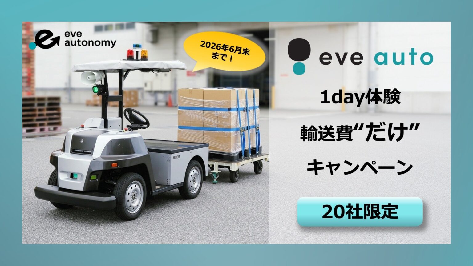 屋外無人搬送サービス「eve auto」を手がけるeve autonomy(静岡県磐田市)は3月9日、顧客の工場・倉庫など実運用の現場で自動走行を1日体験できる「1day体験 輸送費“だけ”キャンペーン」を始めました。申込は6月末まで、先着20社で、費用負担は往復の車両輸送費のみです。