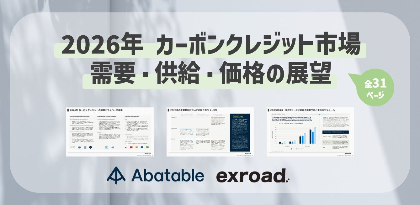 株式会社exroad(東京都港区、代表取締役:木村圭佑)は2026年2月25日、カーボンクレジット市場の需要・供給・価格の展望をまとめた日本語レポートを公表しました。提携先のAbatable社が2026年2月12日に発行した最新レポートを基に再構成し、年次レポートとしては5回目となります。