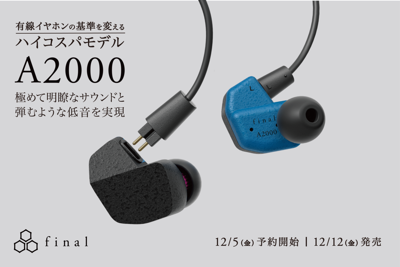 イヤホンブランドfinalが、新しい有線イヤホン「A2000」を税込9,800円で12月12日に発売します。6mm径の自社開発ドライバー「f-Core DU」を搭載し、音の輪郭がはっきりした明瞭なサウンドと、量感のある弾む低音を両立させたのが特徴です。感度は99dB/mW、インピーダンスは19Ωで、スマートフォン用ポータブルアンプやDAPなど幅広い機器で鳴らしやすい仕様としています。