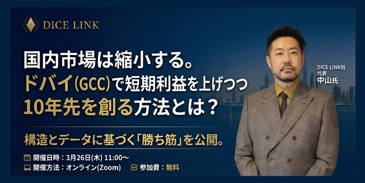 ワンミニッツとダイスリンクは、GCC(ドバイ)市場で成果を出すための戦略と進め方を解説する無料ウェビナーを、2026年3月26日11:00〜12:00にZoomで開きます。登壇はダイスリンク代表の中山大輔氏です。
