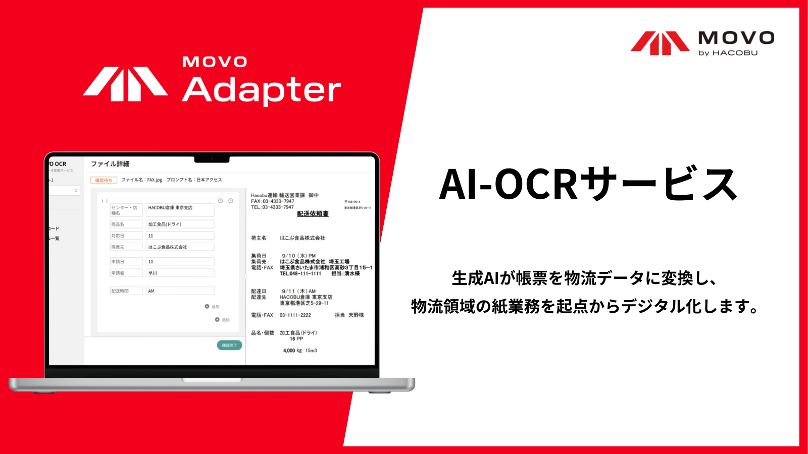 株式会社Hacobu(東京都港区)は2026年2月20日12時30分、生成AIが配送依頼書や発注書などの帳票内容を理解して必要情報を抽出し、物流データ(CSV)として出力するAI-OCRサービス「MOVO Adapter」の提供を始めました。ファイルをアップロードし、抽出結果を確認・修正してCSVを出力する3ステップで利用できます。