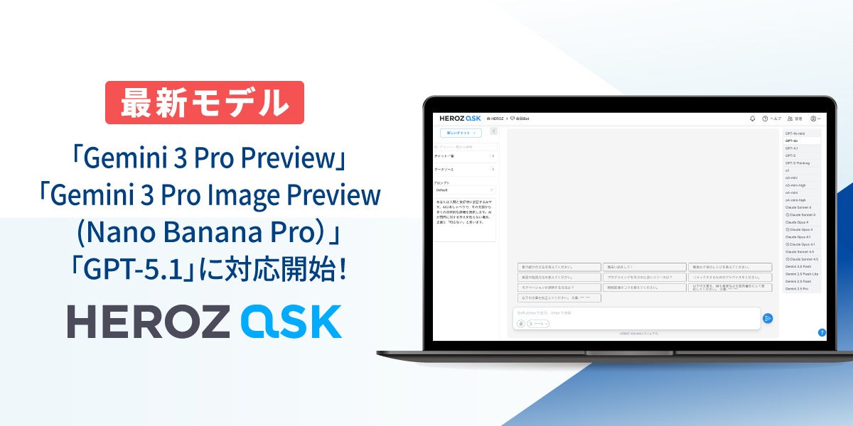 HEROZは法人向け生成AI SaaS「HEROZ ASK」で、Googleの「Gemini 3 Pro Preview」と画像生成の「Gemini 3 Pro Image Preview(Nano Banana Pro)」を2025年12月26日から提供予定です。あわせてOpenAIの「GPT-5.1」への対応も完了し、同日まで待たず即日利用できます。いずれも追加費用なしです。Gemini 3 Pro Previewは視覚・推論・数学の性能向上と安全性を特徴とし、Image Previewは生成・編集を含む画像制作に使えるモデルです。GPT-5.1はエージェント作業やコーディングで高速処理と対話性能の向上をうたいます。HEROZ ASKは社内データの検索、要約、翻訳、音声文字起こしなどに対応し、提供開始から1年で導入は300社超としています。今後は最新モデル対応を継続し、機能更新で現場定着までの支援を強める方針です。
