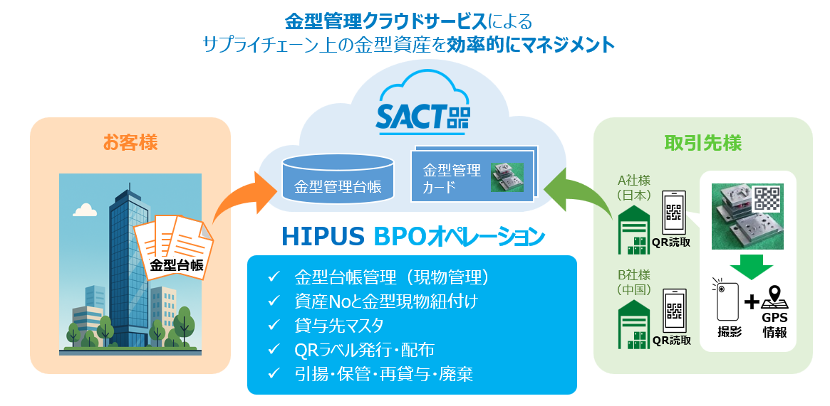 調達ソリューションを手がける株式会社HIPUSは2026年1月、金型管理に特化したSaaSと業務代行(BPO)を組み合わせた「金型管理クラウドサービス『SACT』」の提供を開始しました。金型に耐久性のあるQRラベルを貼付し、スマートフォンで読み取って金型の写真と位置情報を取得、クラウド上の金型台帳と紐づけて所在を可視化する仕組みです。