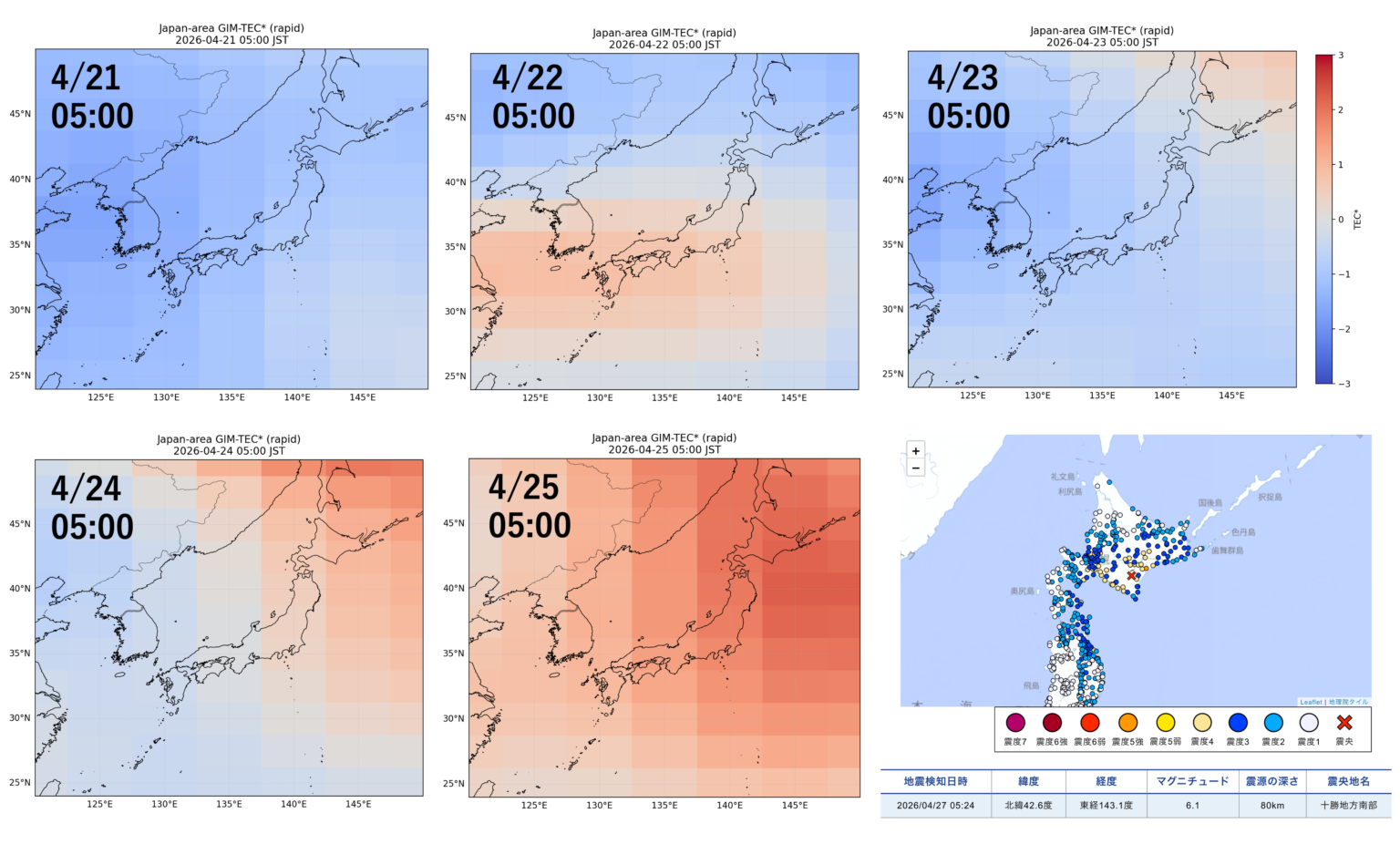 千葉大学関連スタートアップのHiSR(東京都港区)は4月30日、4月27日5時24分頃に発生した北海道十勝地方南部地震(M6.1、最大震度5強)に関し、発生2〜3日前に北海道周辺と日本北東部で電離圏総電子数(電離圏電子量)が顕著に増加した可能性があると明らかにしました。増加の異常度は3σ近くとしています。